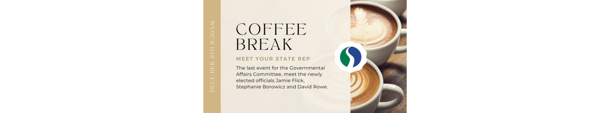 Join the Greater Susquehanna Valley Chamber of Commerce's Governmental Affairs Committee for an informal "Coffee Break" with Newly Elected Officials. Representatives Jamie Flick, Stephanie Borowicz and David Rowe will be available to chat with you as you enjoy your morning coffee or a full breakfast.